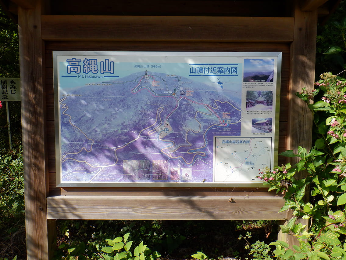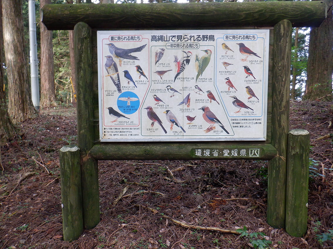 高縄山案内板奥道後多摩川県立自然公園の頂点に立つ高縄山は、標高986m。ブナの原生林が残る山頂付近は、動植物にとってたいへん快適な環境が保たれており、豊かな生態系を育んでいます。この山系は、600種を超える植物、哺乳類、昆虫類の宝庫でもあり、また年間70種に余る鳥類が観察できる愛媛県の代表的な探鳥地の一つとなっています。四国のみちは高縄山の山頂まで行きませんが、高縄寺休憩地に山頂付近の案内板がありますのでご覧ください。