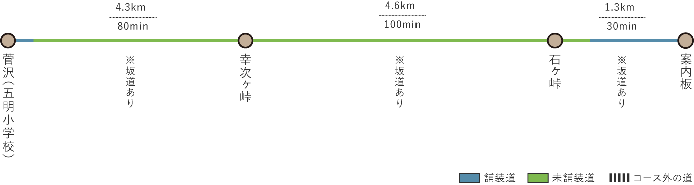 起点 五明小学校松山市菅沢の県道沿いにある五明小学校前が起点です。県道から山側の道を上がっていきます。