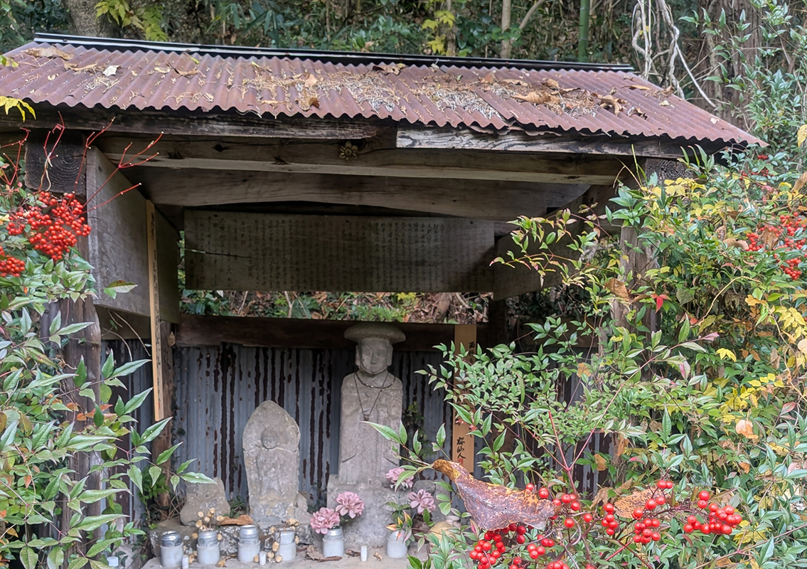 西行法師の石像西行は、平安時代末期から鎌倉時代初期にかけて東北から四国まで各地を旅しながら、『山家集』などの歌集を残しました。その旅の足跡の一つとして、コースのわきに小さな小屋があり、西行法師の石像が祀られています。叙情豊かな歌は後世に大きな影響を与えました。