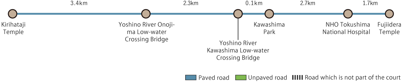 After passing through another rural area, you will reach the banks of Yoshino River. Here, the great Yoshino River flows around a vast delta known as the Zennyuji Island, which disperses the water around you. In fact, you may not even notice that you are in a river as you stand on the fertile land of the delta that spreads before your eyes. Eventually, you will reach Kawashima bridge, which is a low-water crossing bridge that is submerged underwater during heavy rain. If you get off the well-maintained banks, walk around the back of Shiroyama in Kawashima and follow the pilgrimage road, you will see the temple gate of Fujiidera Temple, the 11th temple of the Shikoku Pilgrimage.