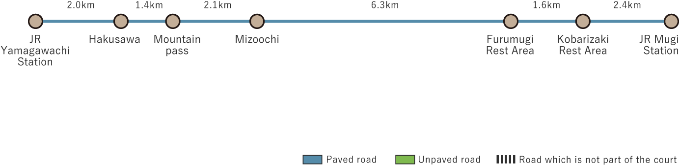 From JR Yamagawachi Station, walk through neatly divided mountainside rice fields to arrive at the village of Hakutaku. Pass through cedar and cypress forests, then enter groves of ubame oak. After crossing the mountain pass, arrive at Ooshima Observation Point, where the vast Pacific Ocean stretches out before you. Descend the mountain pass, cross the Sunline Road, and reach the small settlement of Mizuochi. Walk through clusters of wild camellias in paddy fields cradled by mountains to reach the small settlement of Nada. Soon, you arrive at the calm, sun-warmed fishing port of Furumugi or Sabi Beach. The ocean stretches out before you, with islands like Mugi-Ooshima, Tsushima, and Teba seeming close enough to touch. The Marine Park area is the highlight of Mugi-Ooshima and Tsushima Islands. Pass by the local fishing radio station and through groves of ubame oak to reach the town of Mugi.