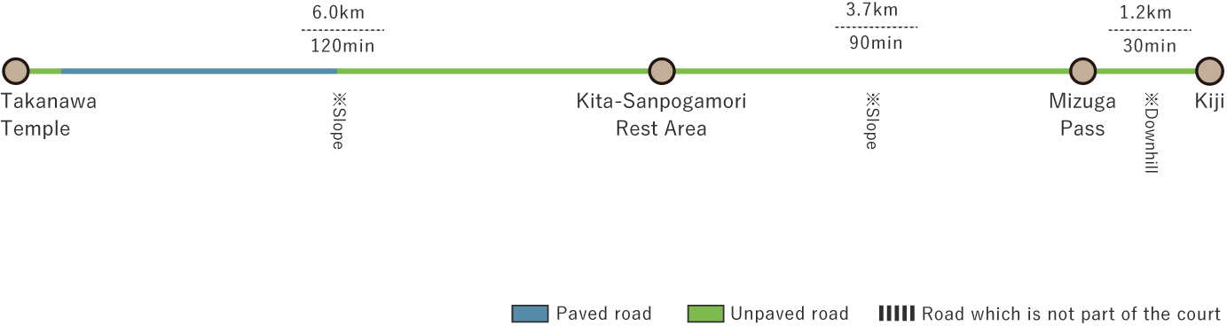 Guidepost (Junction (1))At 3.1 km from Takanawa Temple, you will arrive at a junction where the paved road diverges to an unpaved mountain trail. A guidepost marks this spot, follow the mountain path toward Kita-Sanpogamori. Kita-Sanpogamori lies 2.9 km ahead.