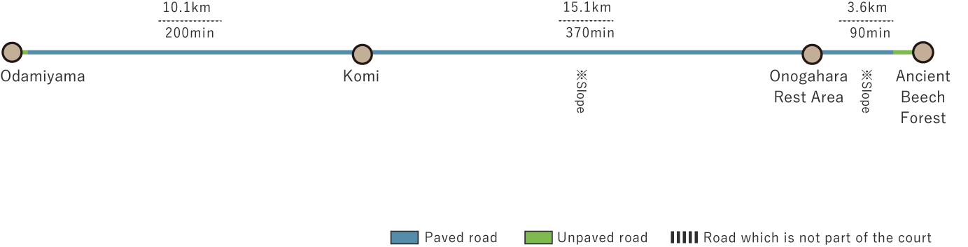 Stretching 28.8 kilometers, this is the longest course in Ehime Prefecture. It begins at the Odamiyama Rest Area in Uchiko Town, winds through Nishitani in Kumakogen Town, pauses at the Onogahara Rest Area in Seiyo City, and leads toward the ancient beech forest.
